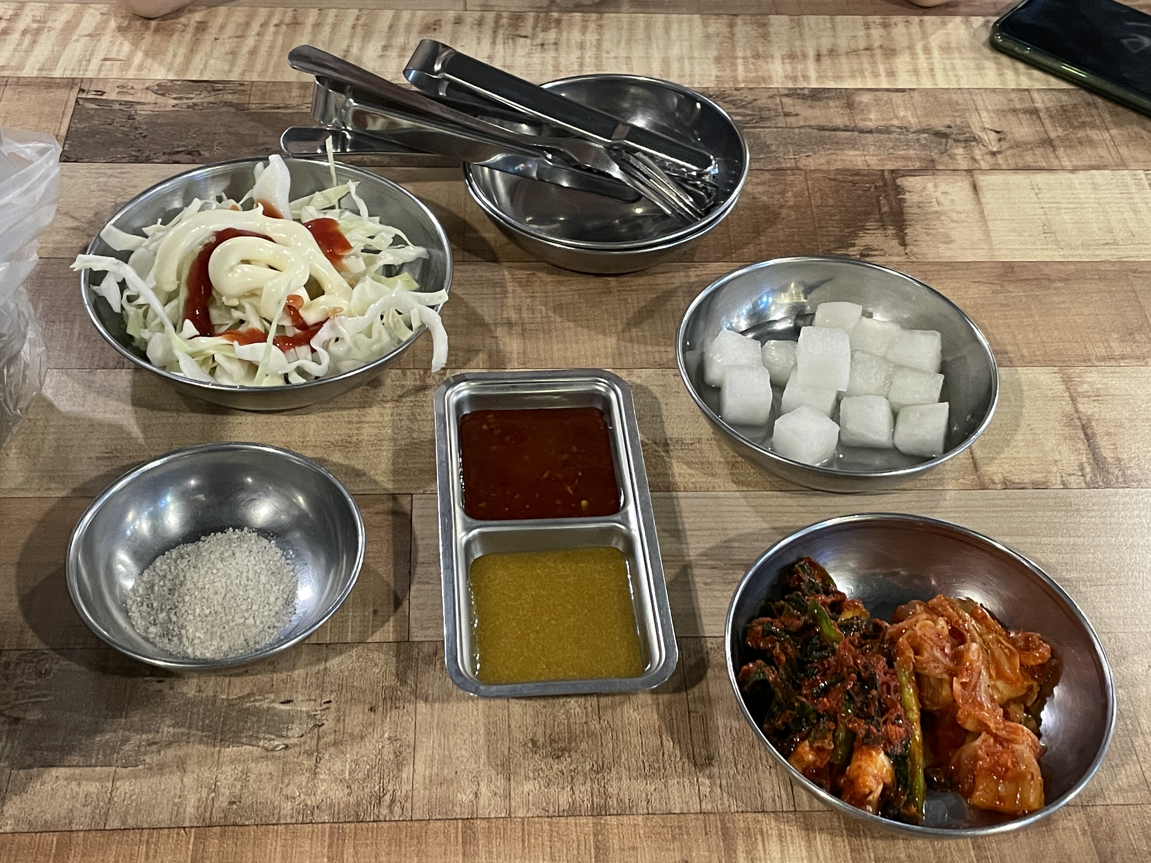 밑반찬 종류 : 양배추/ 절인 무/ 배추김치/ 열무김치(?)